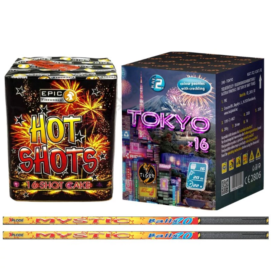 Ez a négy elemből álló tűzijáték-csomag igazán sokszínű és lenyűgöző élményt kínál. A hagyományos, mégis extra látványos effektek finom hanghatásokkal és ragyogó színekkel töltik meg az eget, míg a nagyobb erejű elemek erőteljesebb robbanásokkal fokozzák az ünnepi hangulatot. A csomag első két darabja a 70 cm-es római gyertya, amely klasszikus karakterével, mégis rendkívül színes effektekkel kápráztat. A 20 lövés ragyogó fénygömböket varázsol az égre piros, zöld, kék, arany és ezüst árnyalatokban. A fényekből színes csillagok – piros, zöld, lila és kék – alakulnak ki, finom recsegő effekt kíséretében. A látvány vidám, barátságos, és nem túl hangos, ezért a gyerekek körében is népszerű. A csomag másik két eleme egy-egy 16 lövéses telep, amely vegyes színű, hatalmas pálmafákat rajzol az égboltra, lecsüngő ágakkal. Az effektek 20–25 méteres magasságban bontanak, erőteljes hanggal és látványos formákkal, így igazán monumentális show-t teremtenek.